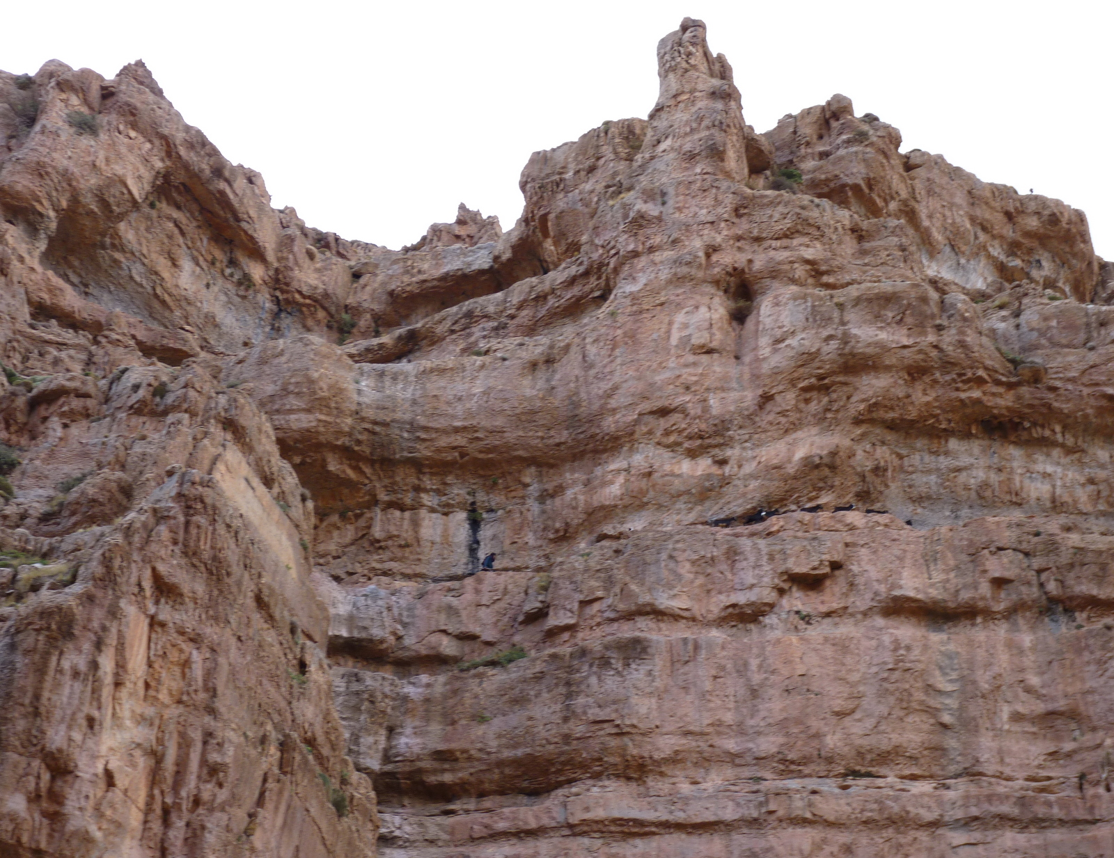 Hirte mit Ziegenherde auf einem Gesimsband in der senkrechten Wand