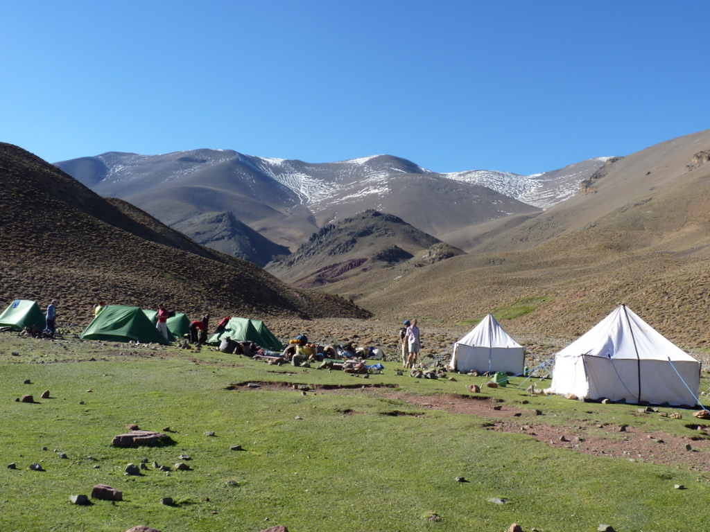 Unsere Schlafzelte (grün), Küchen- und Esszelt (weiß) vor dem MGoun