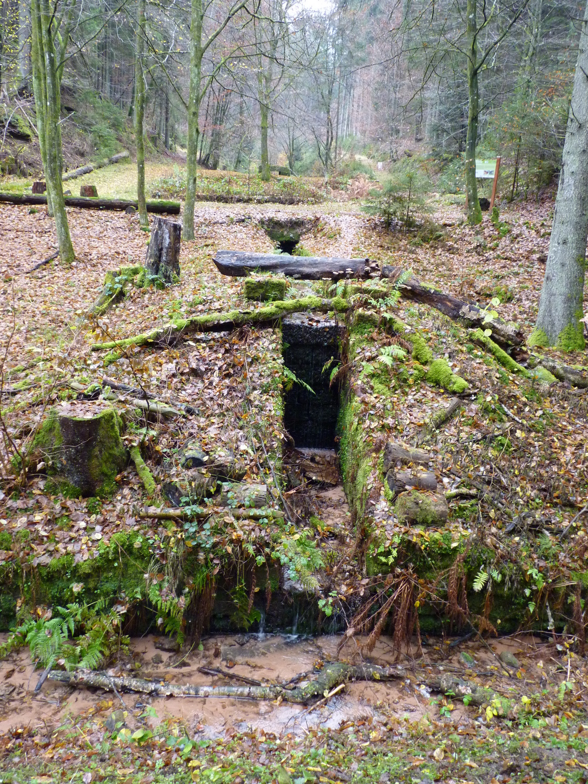Erklärung des Fotos von oben nach unten (bitte scrollen): oben Bildmitte: leerer Woog der oberste Teil des Absperrbauwerkes schaut heraus Querweg mit Trift-Viadukt der Trift-Ablaufkanal des Seitenwoogs mit senkrechtem Absturz zur Beschleunigung der Fließgeschwindigkeit (im Foto fast schwarz) . der zum Triftbach ausgemauerte Storrbach |