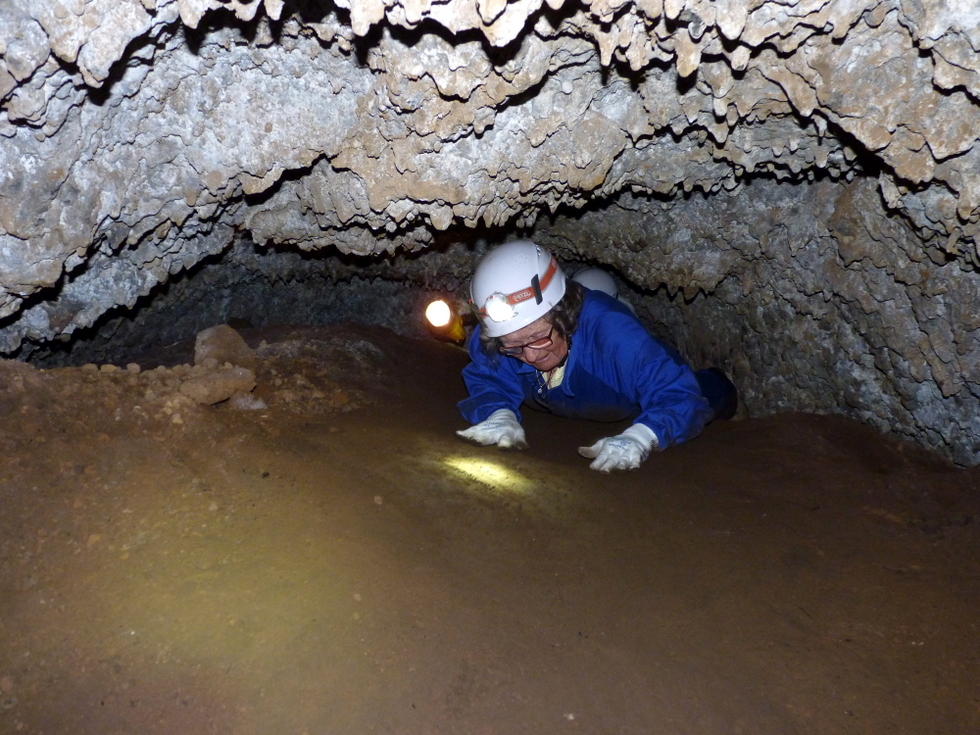 Ende der Höhlentour; Ursel beim Herauskriechen