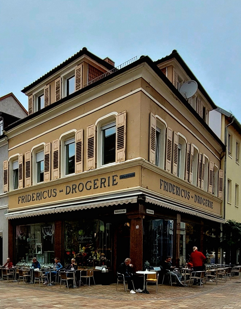Virgogranit. Erhalten sind Teile der Innenausstattung des ehemaligen Ladens.