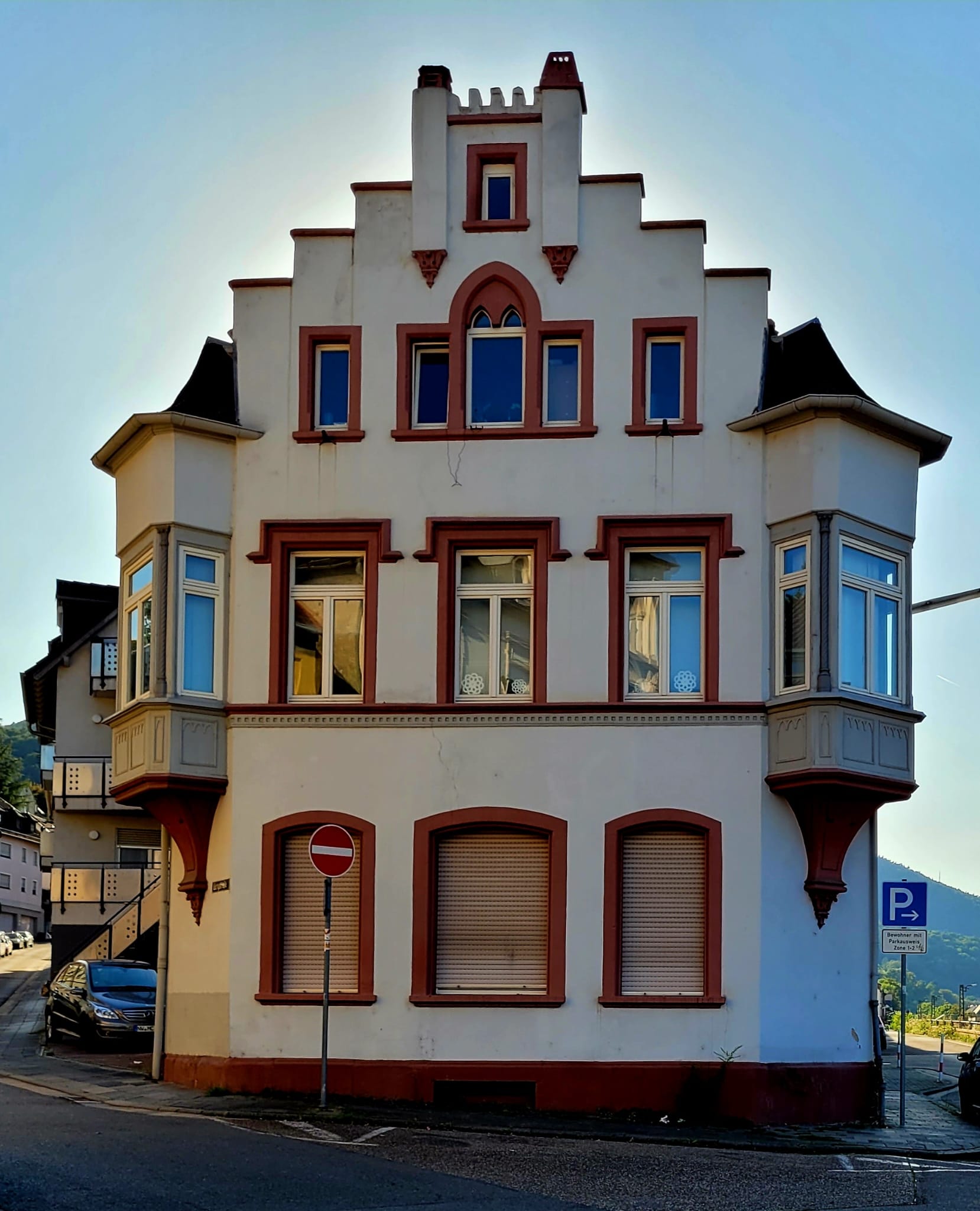 Gründerzeitliches Wohnhaus von 1878 mit neugotisch beeinflussten Formen, besonders an der Stirnseite.
