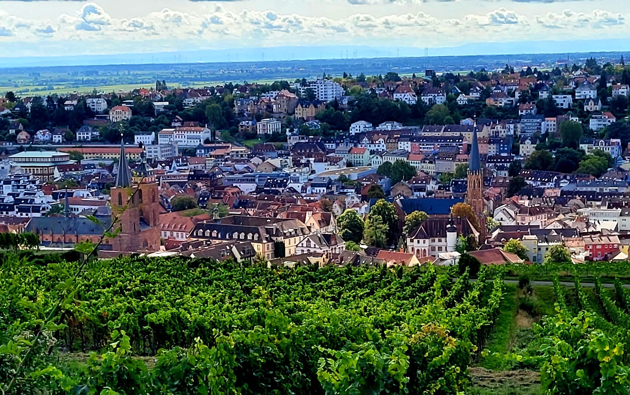 Blick auf Neustadt. Ganz links Mitte der Saalbau. Links