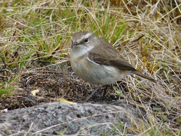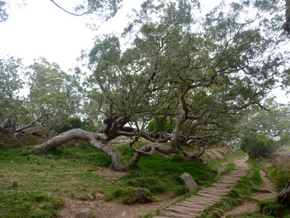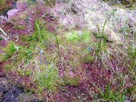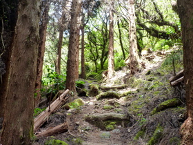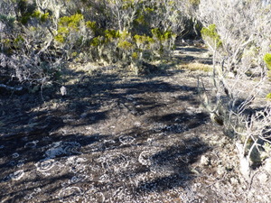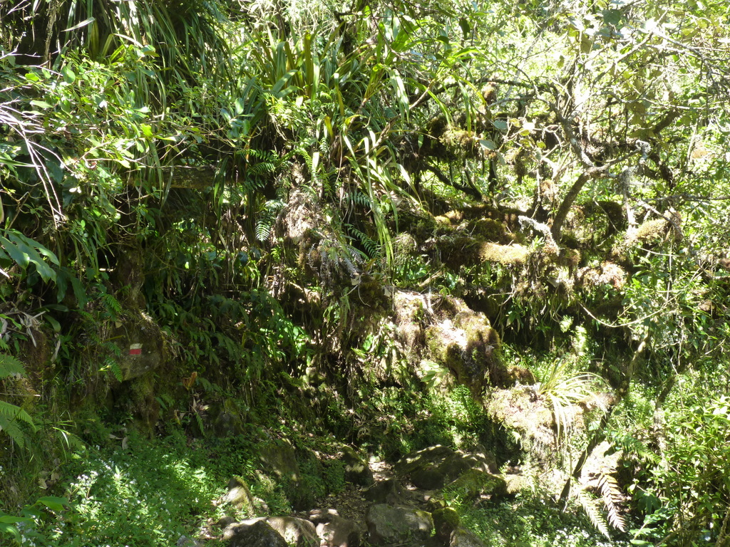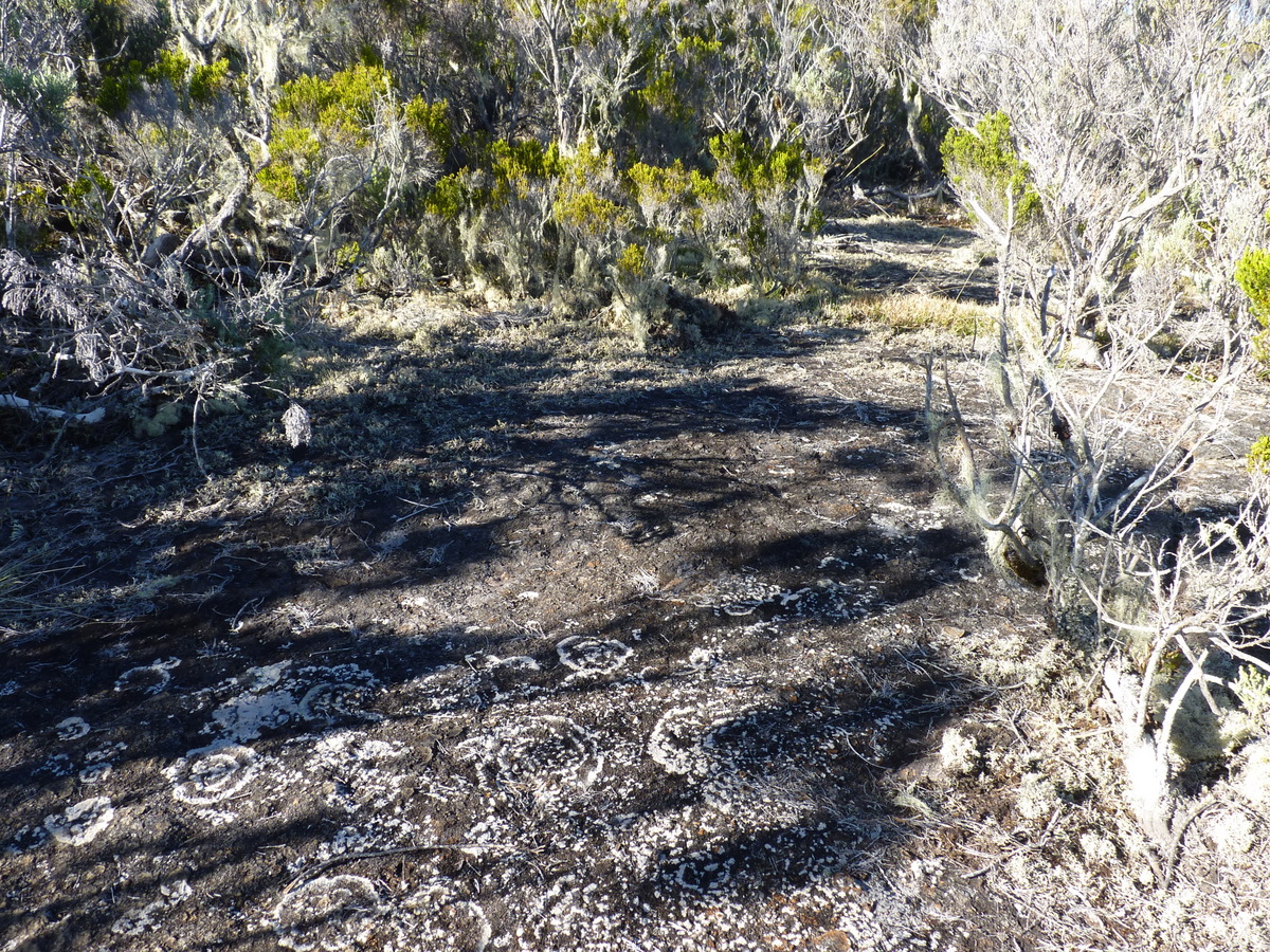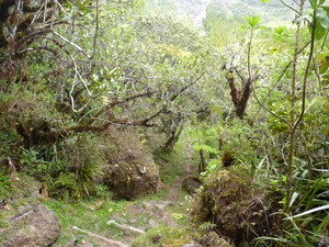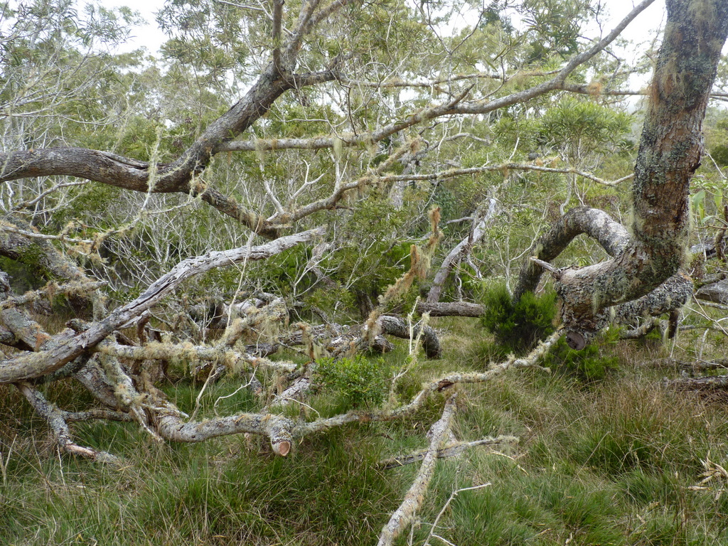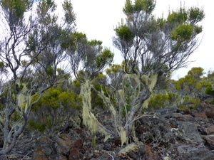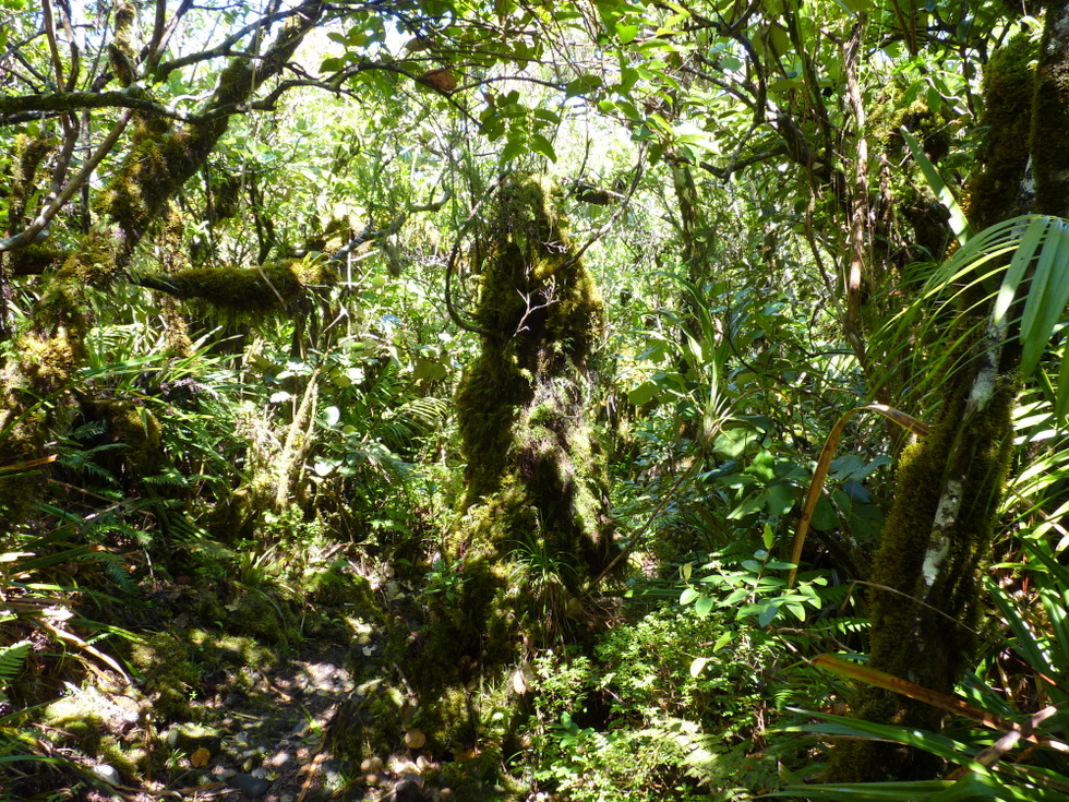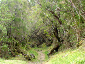 Steil ging es nun, teils auf Betonstufen, hinunter zum Abzweig zum Col de la Fourche (Gabelpass). Gemächlicher, aber stets bergab, führte nun der Weg in moorartiger Landschaft teils auf Holzbohlen weiter. Die Vegetation ist hier, vom Baumfarn abgesehen, recht niedrig, weshalb uns ein mit herunter hängenden Flechten feenhaft aussehender Strauch auffiel. Vorm Abzweig nach Marla hielten wir für ein Picknick an. Der gar nicht scheue Tec-Tec, ein Spatz mit schwarzem Kopf und weißer Kehle, wollte etwas abbekommen und leistete uns daher Gesellschaft.