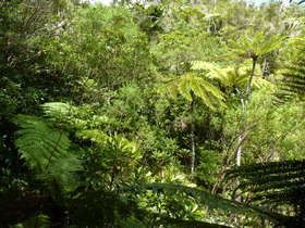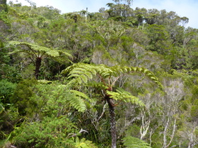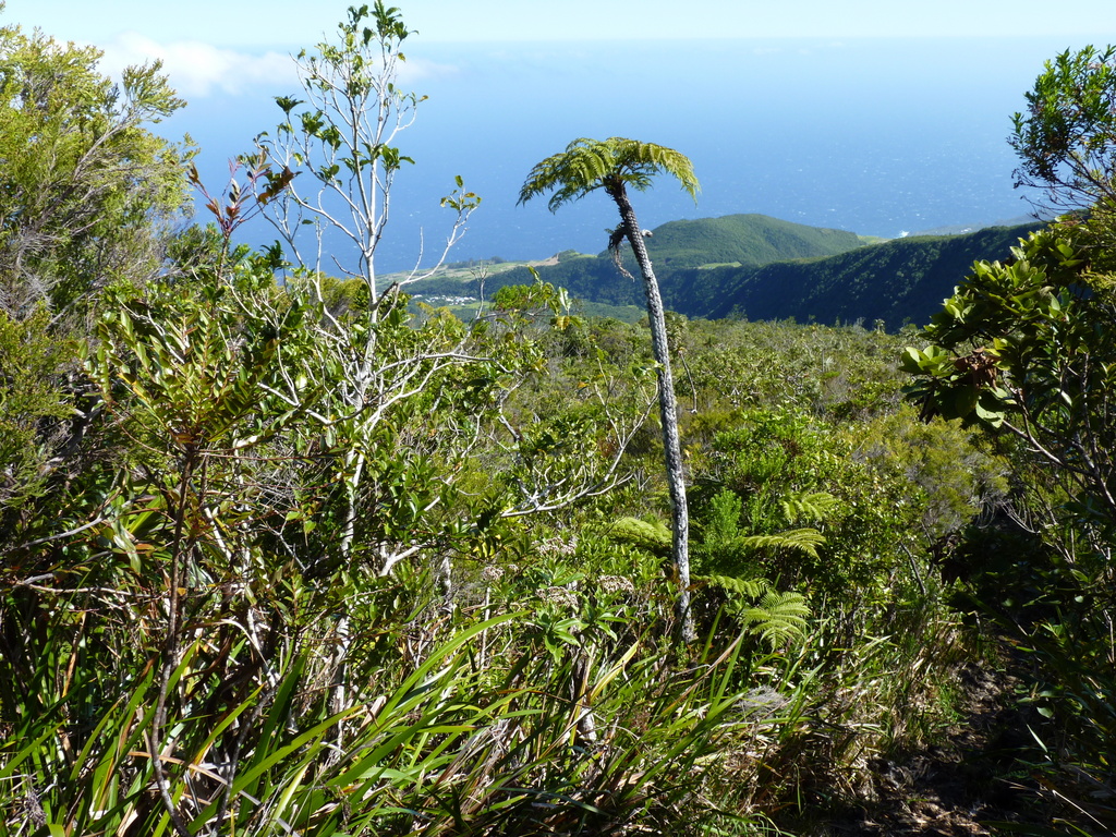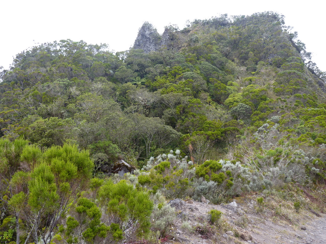 Leider mussten wir nun ein Stück auf einer Asphaltstraße wandern, um zu einem großen bewachten Parkplatz mit Snackbude zu gelangen. Hier parken viele Touristen, um ein paar Tage im autofreien Cirque de Mafate zu wandern. Die nun folgende Schotterstraße wurde leider trotz Verbots von ganz faulen Touristen befahren. Vom Ende der Piste zum Col des Boefs (1.960 m) ist es dann nur noch ein kurzer aber sehr schöner Anstieg zum Sattel. Schön zu sehen, wie sich der Urwald bis zur Spitze des Berges hochzieht.