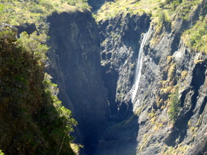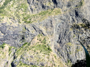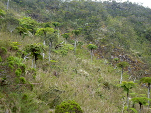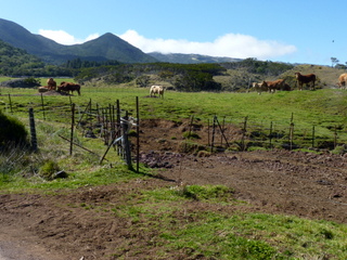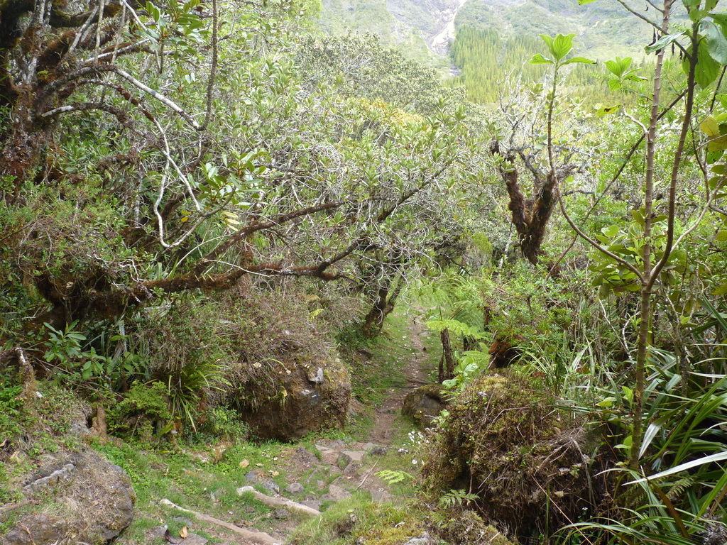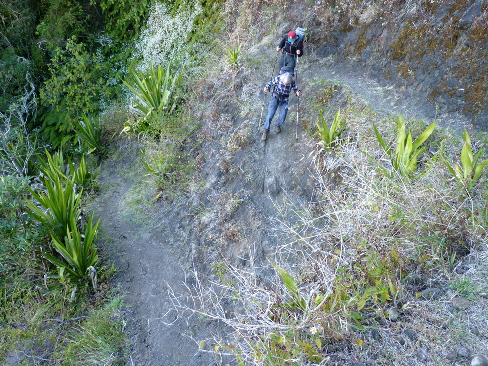Tatsächlich, die Wiese vor der Hütte war am frühen Morgen weiß vom Reif, und das in den Tropen auf 1.400 m Höhe. Vorbei an eingezäunten Weideflächen ging es zunächst gemächlich hinunter. Des öfteren mussten kleine Bachläufe gequert werden. Dann stand uns der atemberaubende Abstieg in die Schlucht des Rivière des Galets bevor. In engen Kehren, teils mit Geröll, teils rutschig führt der Weg steil hinunter. Da bekamen wir schon einen kleinen Vorgeschmack auf die andere Seite.
