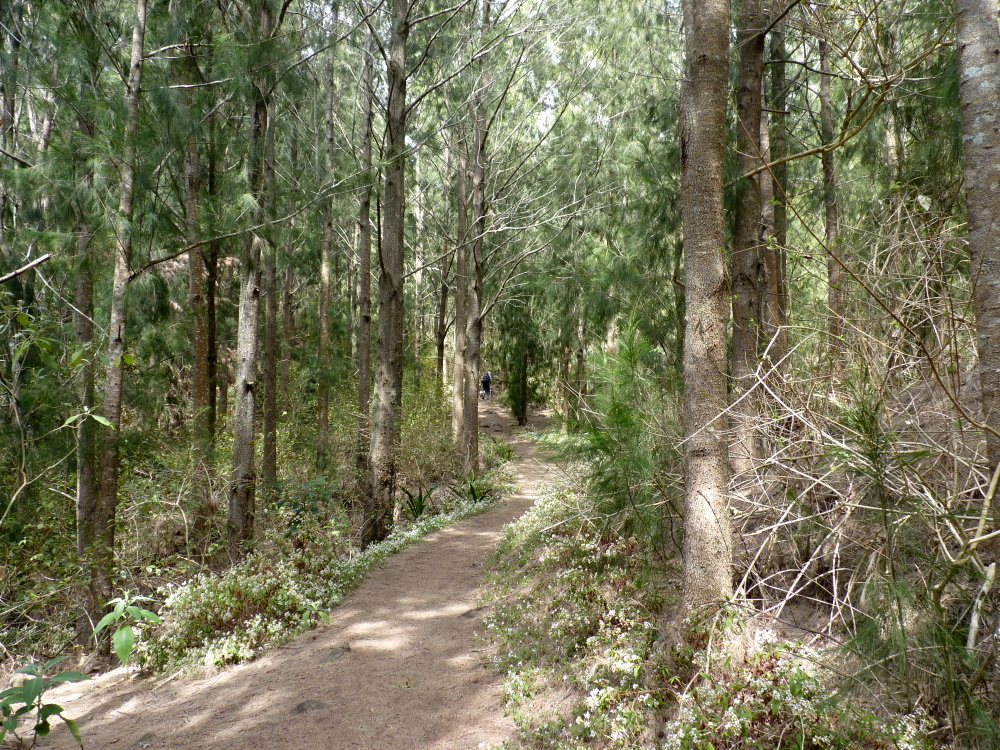 Ein schnurgerader Weg führt über diese Ebene, überraschenderweise durch dichten Wald hindurch. Rother klärt auf: 1875 begrub ein Erdrutsch vom Gros Morne herunter den kleinen Ort Ilet Grand Sable unter sich. Der Platz ist seitdem unbewohnt und zum Schutz gegen weitere Erdrutsche mit Filao-Bäumen aufgeforstet worden.