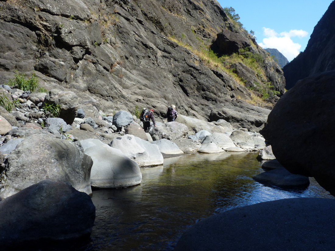 Nun wanderten wir in einem breiten Flussbett mit großen Steinblöcken, viel Geröll und rutschigem Sand aufwärts, vorbei an der Abzweigung nach La Nouvelle. Teils im Flussbett, teils oberhalb führte unser Weg weiter, bis wir den Rivière ein letztes Mal an diesem Tag querten, um teils steil und zuletzt durch einen schönen Filao-Wald Marla und unseren Gîte Trois Roche zu erreichen.