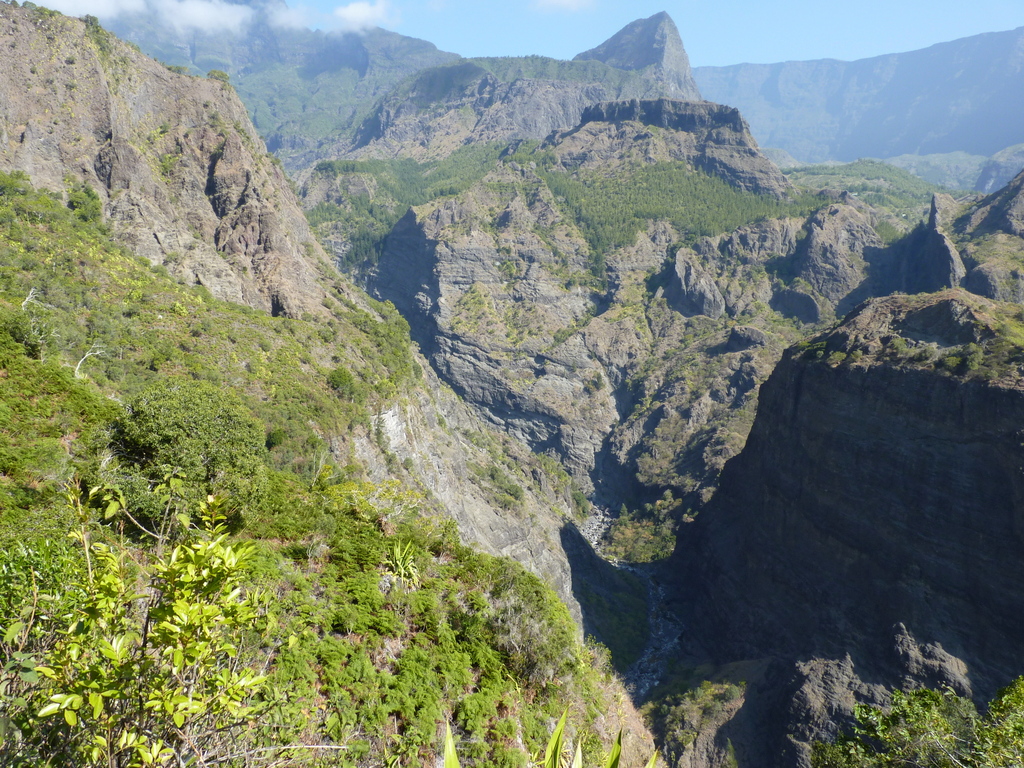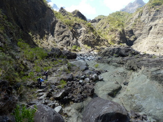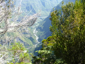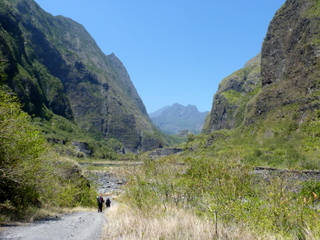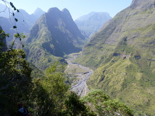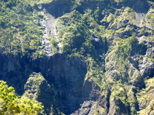 An der Stelle les Deux Bras (die zwei Arme) mussten wir den Nebenbluss queren, der kurz danach in den Rivière des Galets mündet. Den Hauptfluss querten wir mehrmals. Undenkbar in der Regenzeit. Nur ein kurzes Stück wanderten wir flussaufwärts, um sodann nach links abzubiegen und gut 650 Hm zum Aussichtspunkt Bord Bazar in der gleißenden Nachmittagssonne aufzusteigen. Zum Glück kamen wir an einer Quelle (Source Cabris = Zickleinquelle) vorbei, an der wir unsere Wasserflaschen füllten, nachdem wir ausgiebig getrunken hatten. Mit vielen Trinkpausen kamen wir langsam höher. Eine weitere Quelle (Source Bambou = Bambusquelle) rettete uns endgültig vorm Verdursten. Als ich dachte, jetzt müssten wir es eigentlich bald geschafft haben, offenbarte sich nach einer Biegung noch ein Steilstück mit vielen Stufen. Doch auch das bewältigten wir. Am Aussichtspunkt machten wir eine kurze Pause und genossen die Blicke in den Cirque.