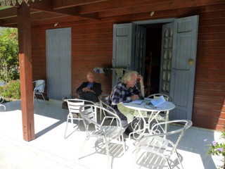 Ruhetag:Die Terrasse unseres Häuschens am Morgen | In Puncto Federvieh ist unser Wirt autark |