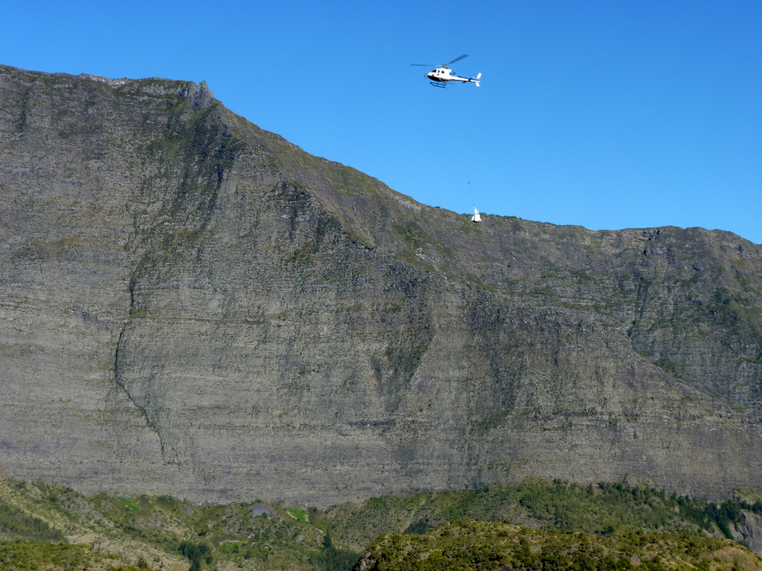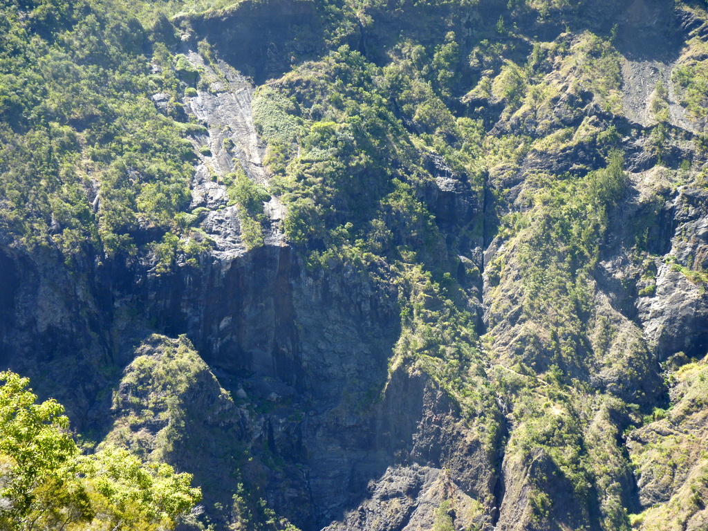 Lastenhubschrauber über dem Cirque de Mafate | Der steile, als gefährlich bezeichnete Weg auf der Gegenseite. Er zieht sich von unten Mitte über die Felsrampe nach oben links |