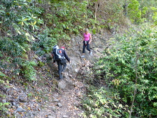 Der Weg war teilweise kein Weg mehr, sondern ein Bachbett, durch das das Wasser schoss. An Stufen entstanden regelrechte Wasserfälle. An vielen Stellen stand der Weg derart unter Wasser, dass wir aufpassen mussten, dass uns das Wasser nicht oben in die Schuhe reinlief. An manchen "Seenplatten" mussten wir uns neben dem Weg durchs Gebüsch schlagen. Zwischenzeitlich überholte uns der Katalane, der denselben Weg ging. Schließlich ist er einige Jahrzehnte jünger als wir.