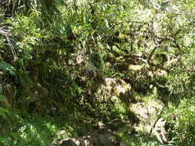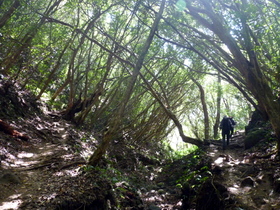 Am Piton de Bois Vert (Grüner Wald) verließen wir den Kraterrand, der uns bei schönem Wetter viele wunderbare Blicke in die Caldera gestattet hätte. Am Puys Ramond betraten wir wieder den Regenwald, um auf zum Teil grobkörniger Lava steiler abzusteigen. Siehe da, es hörte auf zu regnen und die Sonne kam wieder hervor. Aber nasse Wurzeln und glatte Steine zwangen uns, besonders an steilen Stellen, zu großer Vorsicht. Endlich erreichten wir einen Picknickplatz an einer Forststraße. Bei strahlendem Sonnenschein ruhten wir uns ein wenig aus und bewunderten die vielfältige Vegetation mit Farn, Knabenkraut, Wandelröschen, Stechginster usw. Noch ein kurzer Abstieg und wir hatten den Gîte um 17:00 Uhr erreicht. Der Katalane teilte mit uns den Schlafraum. Ein Spanier trat ein und fragte ihn, ob er Spanier sei. Si, antwortete er. Da waren wir platt. Das war doch für ihn die Gelegenheit zu sagen: No, ich bin Katalane. Was hatte er uns gegenüber über die Spanier geschimpft!