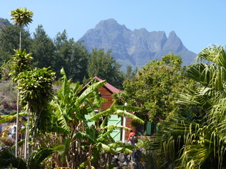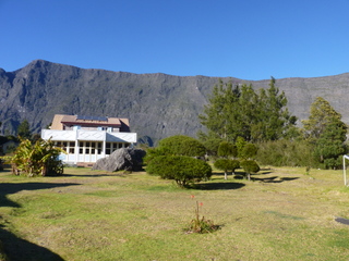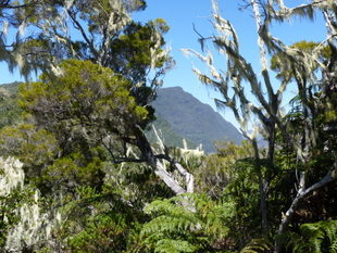 Als wir die Hochebene, Plaine des Tamarins, durchschritten, zogen Nebelschwaden vorüber und tauchten den Tamarinden-Wald in ein gespenstisches Licht. Endlich, gegen 17.00 Uhr, erreichten wir La Nouvelle. Nach einigem Suchen fanden wir auch unseren Gîte, le Relais de Mafate. Das Abendessen war mit 25 € recht teuer. Dafür gab's aber ein schmackhaftes Gemüsegratin als Vorspeise.