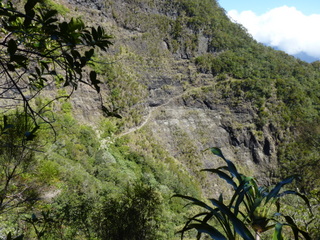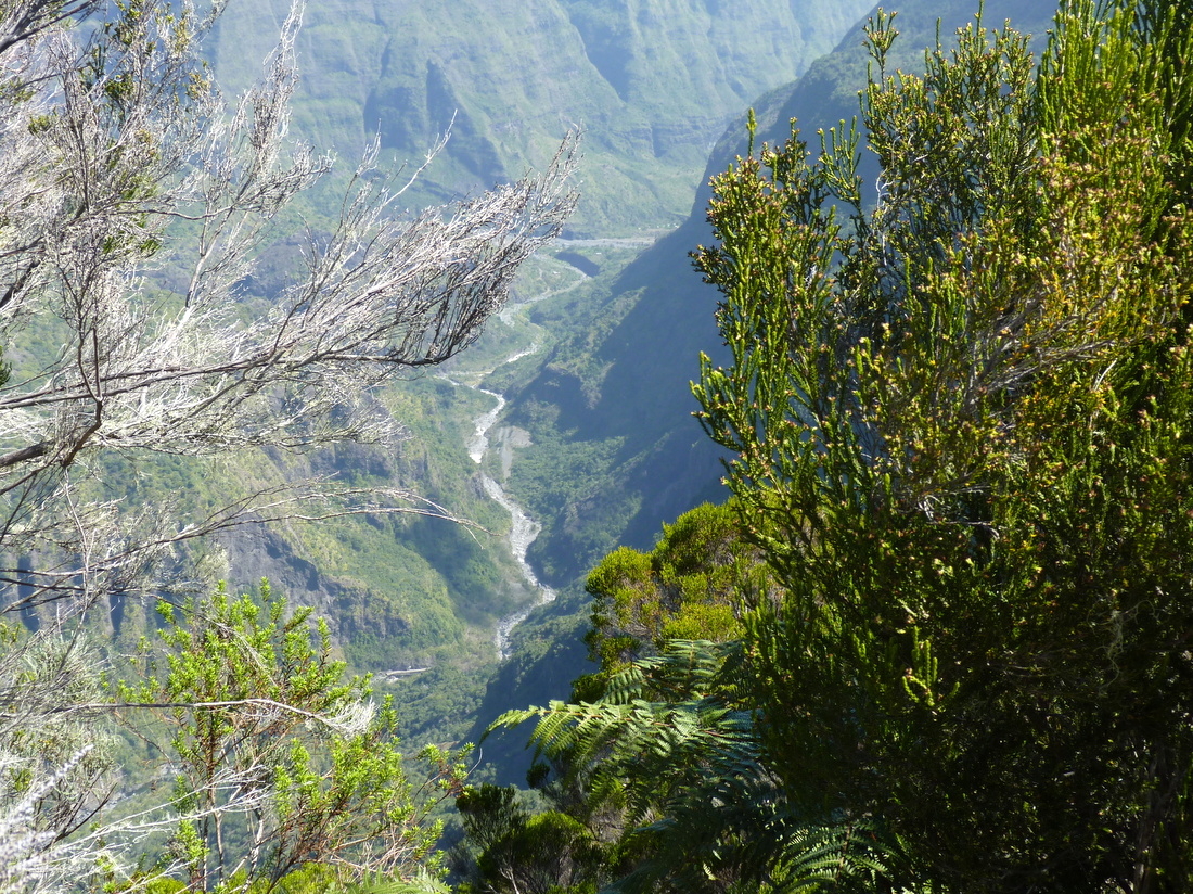3. Wandertag: Grandioser Abstieg in die Schlucht des Rivière des Galets und schweißtreibender Aufstieg nach Îlet à MalheurAuf den Abstieg ins Tal des Galets-Flusses waren wir sehr gespannt. Bei Google Earth sieht man deutlich, dass es knapp 700 Hm an einer fast senkrechten Wand hinuntergeht. Wir hatten keine Ahnung, wie schwierig der Weg ist. Aber da es sich ja um den Weitwanderweg GR 2 handelt, muss es doch für Nichtkletterer möglich sein.