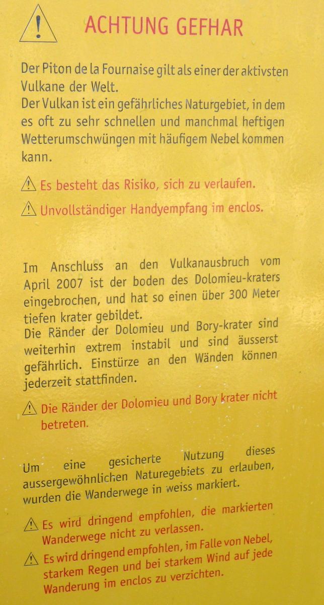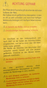 Speiseraum des Gîte du Volcan. Hinten links eins der beiden Buffets | Ausschnit aus dem Schild am Eingang zur inneren Caldera (Enclos) |
