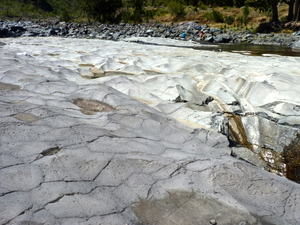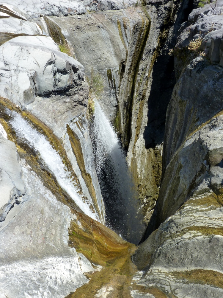 Die Landschaft hatte sich völlig geändert. Die Enge der Schlucht wich einem breiten fast plan geschliffenen Felsplateau mit grauem bis weißem Gestein. Der Wasserstand war niedrig, sodass wir trockenen Fußes auf Steinen hinüberbalancieren konnten. Wenn man bei höherem Wasserstand durchwaten muss, gilt es aufzupassen, dass man nicht mitgerissen wird, zumal sich der Fluss wenige Meter dahinter in eine Schlucht hinabstürzt.