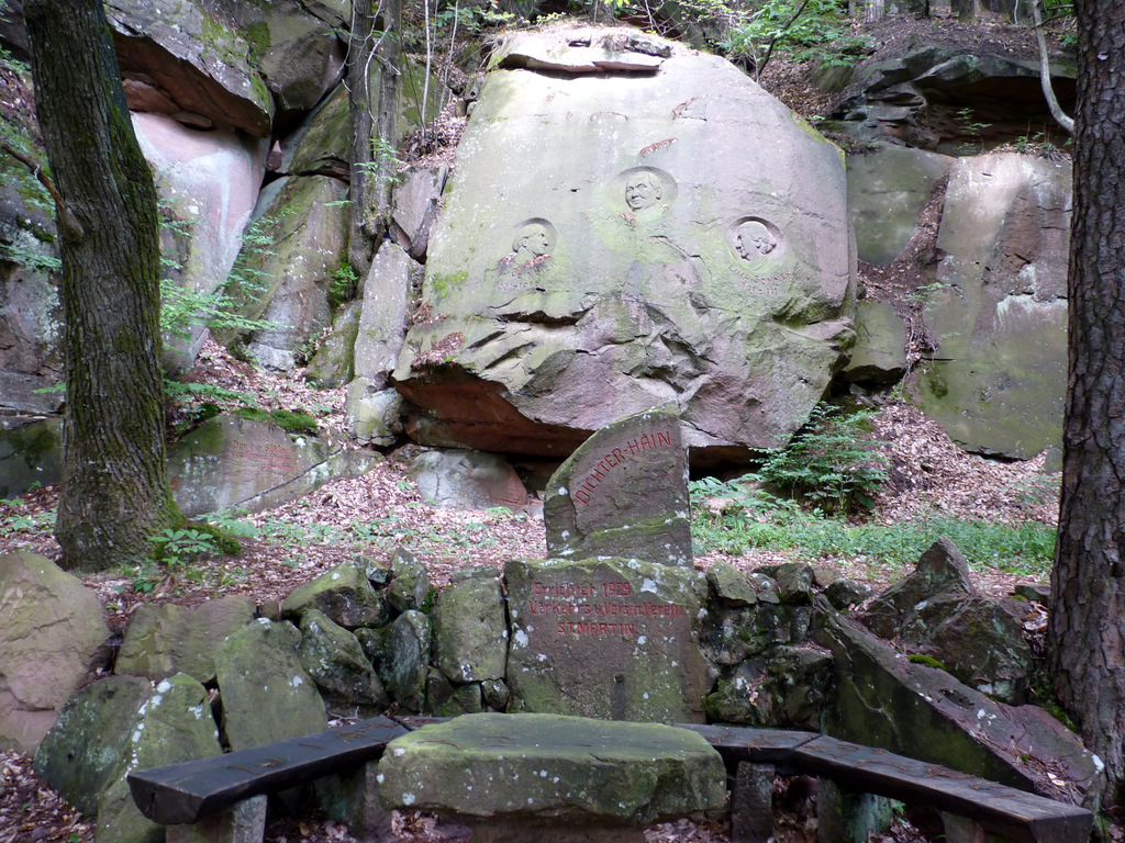 Vom Weiher geht’s hinauf zum Bellachini-Brunnen. Franz Schweizer aus St. Martin war der berühmte Magier Bellachini. (Diese Website klärt auf. Achtung: Zuerst öffnet sich die Homepage, dann „finden“ anklicken und den Suchbegriff „Bellachini“ eingeben, dann „Kurzbiographie Franz Schweizer“ anklicken). Nur wenige Meter oberhalb kann man bei Regen Schutz suchen in der Tina-Will-Blick-Hütte. Vorbei an den Schwalbenfelsen führt der Weg zum Dichterhain. Dort sind die Reliefs von drei Pfälzer Mundartdichtern auf einer großen senkrechten Felsplatte eingemeißelt: August Heinrich, besser bekannt als „Bellemer Heiner“, Lina Sommer und der mir weniger bekannte Dichter und Stadtpfarrer von Edenkoben, Fritz Claus.