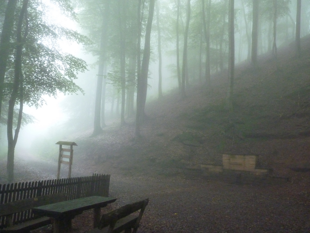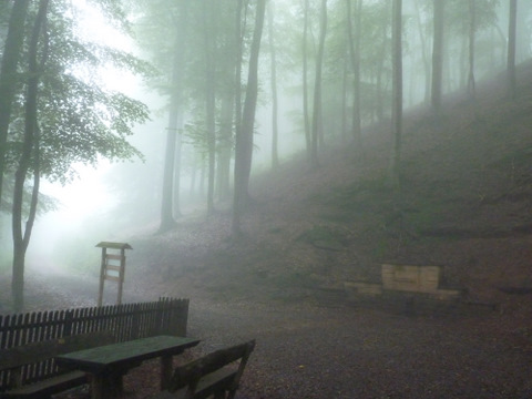 Nun folgte eine lange Etappe durch den Wald. Wir haben uns gefragt, wie das mit einem „Weinsteig“ zu vereinbaren ist, zumal von der Trifelsblick-Hütte aus ein weiter Bogen gespannt wird über das Ramberger Waldhaus Drei Buchen und die interessante Burgruine_Neuscharfeneck zur Landauer Hütte. Ohne Zweifel schöne Waldwege mit einer sehr interessanten Burgruine, aber Weinberge sind weit und breit nicht zu sehen. Eigentlich wollten wir vor der Landauer Hütte biwakieren. Da das Wetter sehr unbeständig war, beschlossen wir, bis zur Schutzhütte an der Holderquelle zu gehen, womit wir einen langen Wandertag nochmals verlängerten. Wir stiegen ab nach Dernbach, vorbei am Dernbacher Haus. Diese Hütte ist nur montags geschlossen. Wer montags wandert, legt am besten einen Fastentag ein oder ist fürs Picknicken ausgerüstet. Ängstlich schauten wir ständig zum Himmel hinauf. Dennoch kam der Regenguss überraschend. Wir hatten Glück und konnten uns unter ein Dach an einem leer stehenden Trakt des Sanatoriums Eußertal retten. Über eine Stunde schüttete es. Wir hatten uns schon mit dem Gedanken vertraut gemacht, hier übernachten zu müssen. Wasser gab's ja genug von oben. Aber der Regen ließ nach und wir brachen auf, in der Hoffnung, noch vor Einbruch der Dunkelheit die Holderquelle zu erreichen.