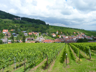 Als wir in Annweiler ankamen, schien wieder die Sonne, sodass wir in der Markwardanlage, dem Kurpark Annweilers, nach einem Besuch beim Bäcker auf einer Parkbank gemütlich frühstücken konnten. Vorbei an der Burgdreifaltigkeit, Trifels, Anebos und Scharfenberg, erreichten wir die Ruine Neukastel und den Slevogthof. Endlich taucht man nun wieder in das Rebenmeer der Deutschen Weinstraße ein. Nach Passieren des malerischen Weindorfes Leinsweiler bietet sich wieder Burgenromantik mit den Ruinen Madenburg und Landeck. Welch Freude, die Schänke in der Ruine Landeck ist auch montags geöffnet. Nach nur wenigen Metern gelangt man in das nächste Weindorf, Klingenmünster.