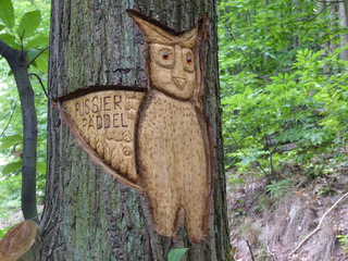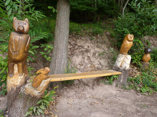 Vorbei an der St. Ottilia-Kapelle gelangten wir ins Edenkobener Tal, um dann zum Hilschweiher und zur Villa_Ludwigshöhe weiter zu wandern. An Wochenenden gibt es hier viel Betrieb. Zum einen wegen der Talstation der Sesselbahn zur Rietburg, zum andern wegen den Besucherströmen zum ehemaligen Sommersitz des bayerischen Königs Ludwig I. Außer der Villa selbst lädt vor allem die dortige Max-Slevogt-Galerie zum Besuch ein. Nun folgte ein interessantes und lustiges Stück Weg, das Pussierpädel. Viel Arbeit haben sich hier die Holzschnitzer gemacht, die aus einer ganzen Reihe von Baumstümpfen und in Baumrinden hinein Figuren geschnitzt und teils noch mit weiteren Figuren bereichert haben.